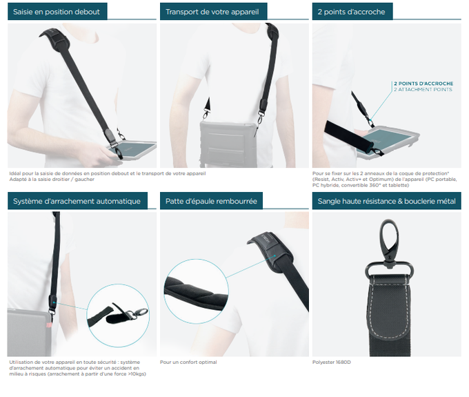 Fonctionnalités et contrôle | Saisie en position debout et transport de votre appareil : idéal pour la saisie de données en position debout et le transport de votre appareil. 2 points d'accroche : pour se fixer sur les é anneaux de la coque de protection de l'appareil Système d'arrachement automatique : Utilisation de votre appareil en toute sécurité et éviter un accident en milieu à risque Patte d'épaule rembourrée : confort optimal Sangle haute résistance et bouclerie métal |