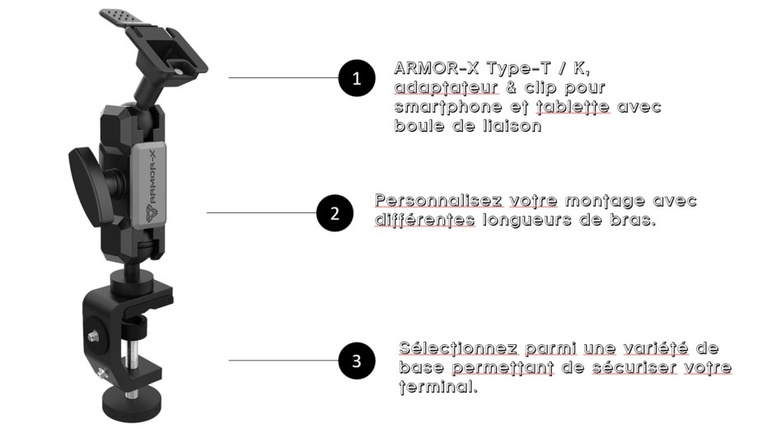 Caractéristiques | Montage d'un bras court simple parmi une variété de bases permettant de sécuriser votre terminal |
