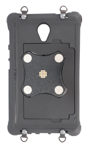 Coque de protection pour tablette avec 4 anneaux rivetés en D avec un système de chargement magnétique au dos de la tablette. Système compatible avec les accessoires de Tablette store (Rubrique sur le site « CHARGES MAGNETIQUE »)