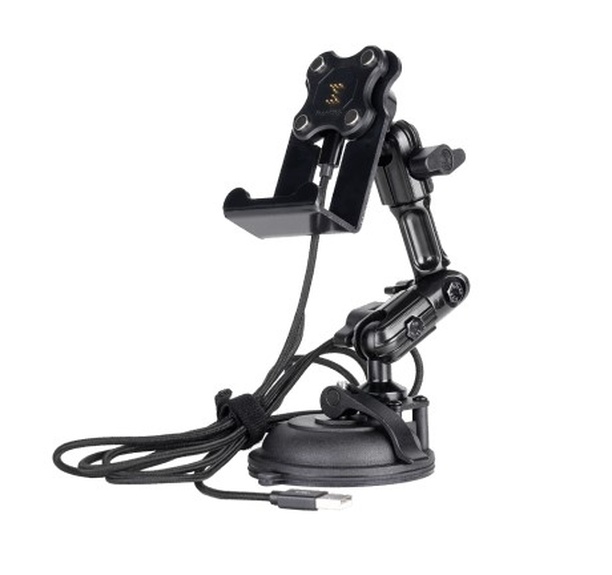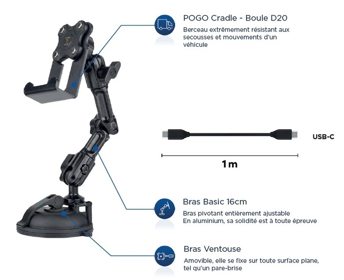 Le kit de charge véhicule ventouse est composé du POGO Cradle, du bras basic 16cm ainsi que de la base ventouse à clapet et d'un câble charge/données d'un mètre. (NB : Le chargeur n'est pas fourni)