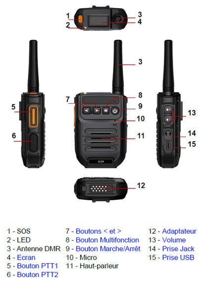 Caractéristiques | DMR Tier II dans la bande Puissance RF : 2W Portée : Supérieur à 300 m Chiffrement DMR : AES 25 | |