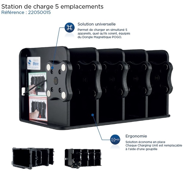 Fonctionnalité de contrôle | Permet de charger en simultané 5 appareils équipés du Dongle Magnétique POGO | |
