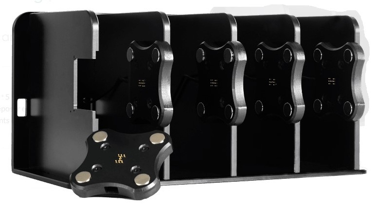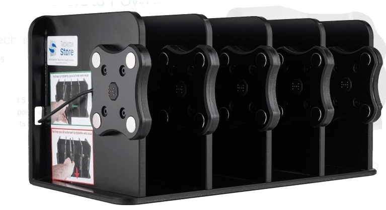 Rack de charge magnétique de 5 emplacements pour tablette et qui permet de bénéficier de la recharge rapide et simultanée de 5 appareils équipés du Dongle Magnétique POGO.